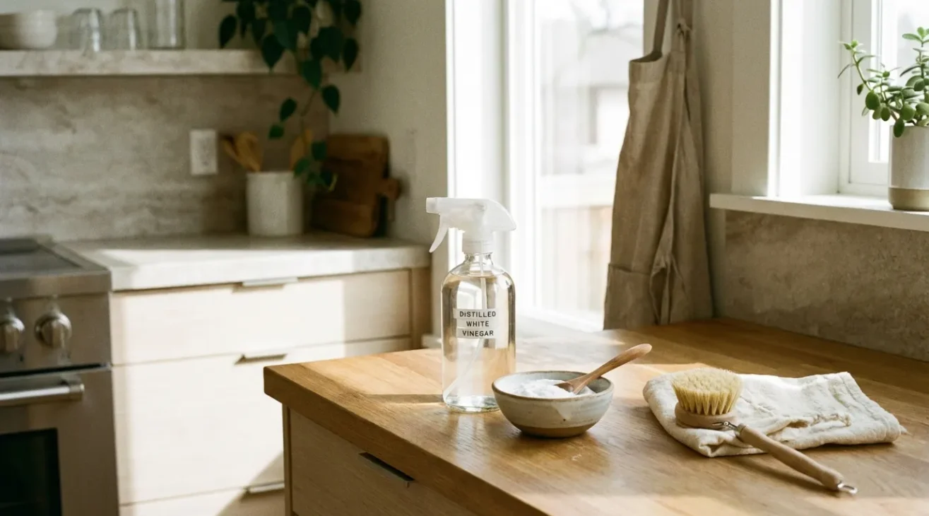 Ein klassischer Allzweckreiniger lässt sich mit wenigen Handgriffen ersetzen: Mische warmes Wasser mit einem Schuss Essig. Für stärkere Verschmutzungen kommt ein Teelöffel Natron hinzu. Diese Mischung reicht für Küchenoberflächen, Fliesen und sogar den Kühlschrank.